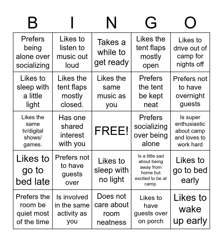 This bingo card has a free space and 28 words: Likes to go to bed early, Is ok with sharing snacks, Prefers the tent be kept neat, Likes to have guests over on porch, Likes to sleep with a little light, Takes a while to get ready, Likes to listen to music out loud, Likes to go to bed late, Prefers socializing over being alone, Prefers the room be quiet most of the time, Likes the same tv/digital shows/ games., Likes the tent flaps mostly open, Is involved in the same activity as you, Does not care about room neatness, Prefers not to have overnight guests, Is from a town/area near yours, Prefers not to have guests over, Likes the tent flaps mostly closed., Likes the same music as you, Likes to sleep with no light, Prefers being alone over socializing, Doesn't take long to get ready, Likes to wake up early, Has one shared interest with you, Is super enthusiastic about camp and loves to work hard, Is a little sad about being away from home but excited to be at camp., Likes to drive out of camp for nights off and Prefers to stay in camp for nights off.