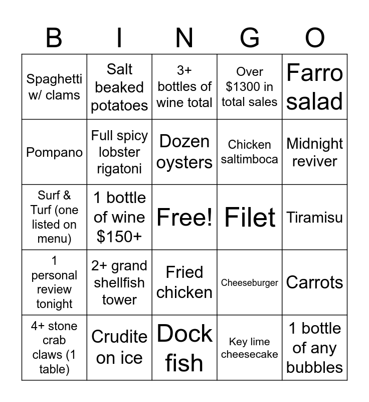 This bingo card has a free space and 24 words: 2+ grand shellfish tower, Crudite on ice, Dozen oysters, 4+ stone crab claws (1 table), Farro salad, Spaghetti w/ clams, Pompano, Salt beaked potatoes, Filet, Fried chicken, Chicken saltimboca, Surf & Turf (one listed on menu), Cheeseburger, Carrots, Full spicy lobster rigatoni, Key lime cheesecake, Tiramisu, 3+ bottles of wine total, Midnight reviver, 1 bottle of wine $150+, 1 bottle of any bubbles, 1 personal review tonight, Over $1300 in total sales and Dock fish.