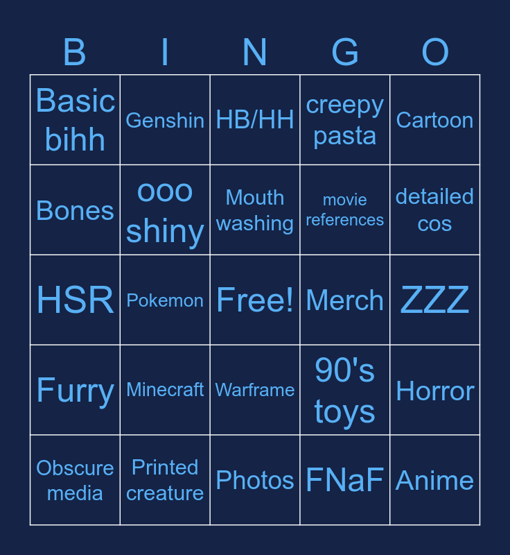 This bingo card has a free space and 24 words: Minecraft, Printed creature, Mouth washing, Obscure media, Cartoon, Basic bihh, Bones, Genshin, Merch, Warframe, movie references, HSR, 90's toys, Horror, ooo shiny, FNaF, ZZZ, HB/HH, detailed cos, Pokemon, Anime, Furry, creepy pasta and Photos.
