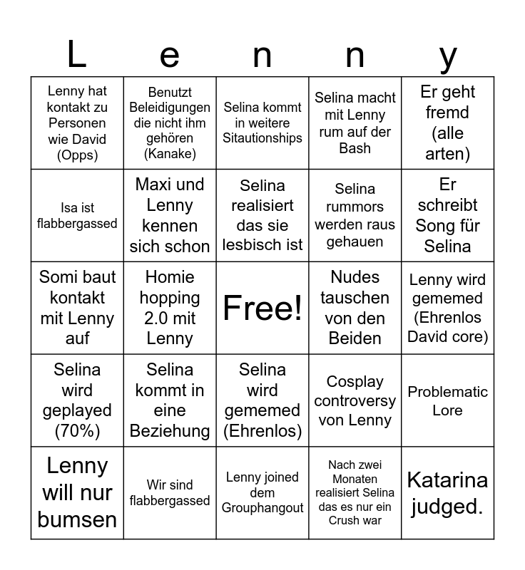 This bingo card has a free space and 24 words: Lenny will nur bumsen, Selina kommt in eine Beziehung, Selina realisiert das sie lesbisch ist, Nach zwei Monaten realisiert Selina das es nur ein Crush war, Er geht fremd (alle arten), Lenny hat kontakt zu Personen wie David (Opps), Benutzt Beleidigungen die nicht ihm gehören (Kanake), Selina kommt in weitere Sitautionships, Nudes tauschen von den Beiden, Lenny wird gememed (Ehrenlos David core), Somi baut kontakt mit Lenny auf, Maxi und Lenny kennen sich schon, Cosplay controversy von Lenny, Problematic Lore, Isa ist flabbergassed, Wir sind flabbergassed, Lenny joined dem Grouphangout, Selina macht mit Lenny rum auf der Bash, Er schreibt Song für Selina, Selina wird geplayed (70%), Homie hopping 2.0 mit Lenny, Selina wird gememed (Ehrenlos), Selina rummors werden raus gehauen and Katarina judged..