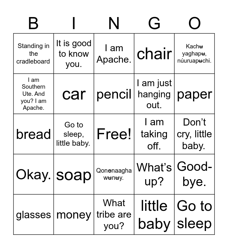 This bingo card has a free space and 27 words: What’s up?, I am not doing anything. And you?, I am just hanging out., What tribe are you?, I am Southern Ute. And you? I am Apache., I am Apache., It is good to know you., Okay., I am taking off., Good-bye., bread, chair, glasses, money, paper, airplane, car, pencil, soap, Standing in the cradleboard, Don’t cry, little baby., little baby, Go to sleep, little baby., Go to sleep, Qonɵnaagha wʉnʉy., Kachʉ yaghapʉ, núuruapʉchi. and Pʉikway, nuuruapʉchi..