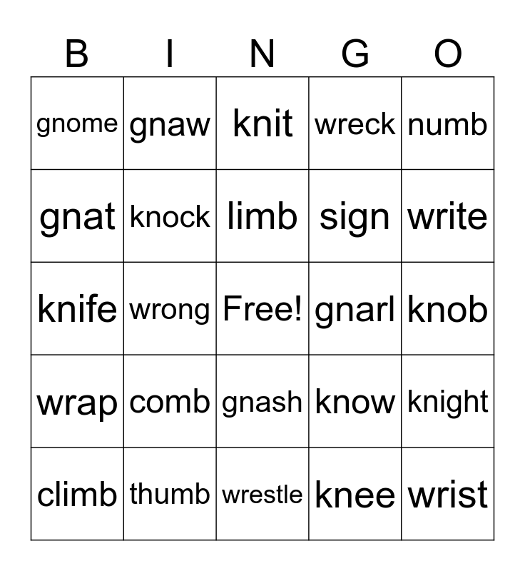 This bingo card has a free space and 24 words: comb, thumb, limb, climb, numb, gnome, gnat, gnaw, gnarl, gnash, sign, knife, know, knight, knock, knee, knob, knit, write, wrong, wrist, wrap, wreck and wrestle.