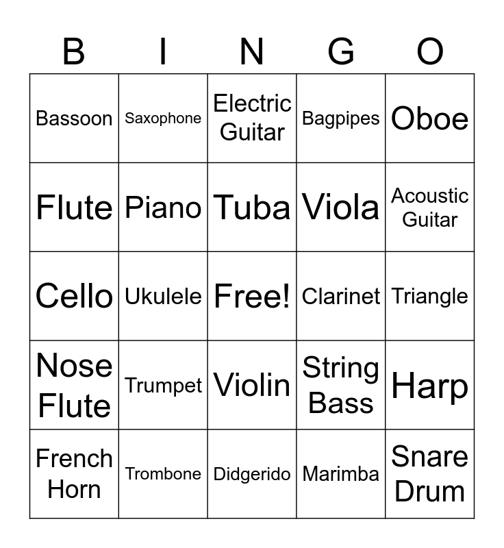 This bingo card has a free space and 24 words: Trumpet, Trombone, Tuba, French Horn, Oboe, Bassoon, Flute, Saxophone, Clarinet, Violin, Viola, Cello, String Bass, Harp, Piano, Marimba, Triangle, Electric Guitar, Acoustic Guitar, Ukulele, Snare Drum, Nose Flute, Bagpipes and Didgerido.