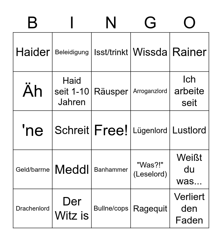 This bingo card has a free space and 24 words: Meddl, Der Witz is, Räusper, Drachenlord, Rainer, Haider, Äh, Beleidigung, Lügenlord, Banhammer, Arroganzlord, 'ne, "Was?!" (Leselord), Weißt du was..., Haid seit 1-10 Jahren, Ragequit, Lustlord, Isst/trinkt, Ich arbeite seit, Schreit, Verliert den Faden, Geld/barrne, Wissda and Bullne/cops.