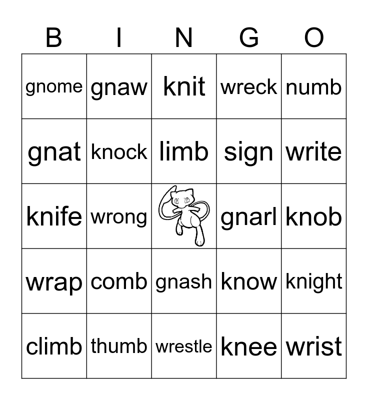 This bingo card has a free space and 24 words: comb, thumb, limb, climb, numb, gnome, gnat, gnaw, gnarl, gnash, sign, knife, know, knight, knock, knee, knob, knit, write, wrong, wrist, wrap, wreck and wrestle.