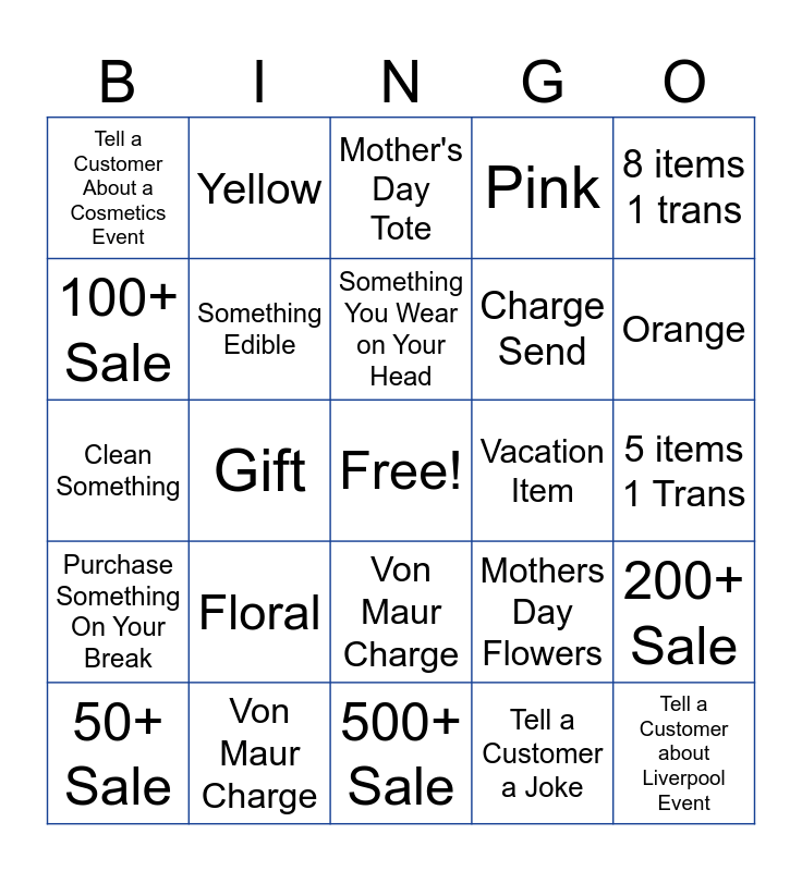 This bingo card has a free space and 24 words: Floral, Von Maur Charge, Something You Wear on Your Head, 50+ Sale, 8 items 1 trans, Tell a Customer About a Cosmetics Event, 100+ Sale, Yellow, Vacation Item, Von Maur Charge, Charge Send, Clean Something, Mothers Day Flowers, 200+ Sale, Something Edible, Tell a Customer a Joke, 5 items 1 Trans, Mother's Day Tote, Orange, Gift, Tell a Customer about Liverpool Event, Purchase Something On Your Break, Pink and 500+ Sale.