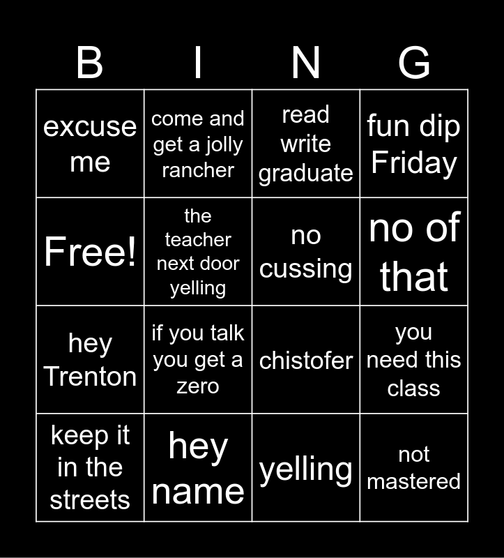 This bingo card has 16 words: hey name, you need this class, read write graduate, excuse me, hey Trenton, come and get a jolly rancher, chistofer, yelling, Free!, the teacher next door yelling, keep it in the streets, fun dip Friday, if you talk you get a zero, no of that, no cussing and not mastered.