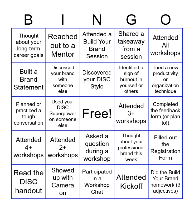 This bingo card has a free space and 24 words: Attended 2+ workshops, Showed up with Camera on, Discovered your DISC Style, Read the DISC handout, Attended All workshops, Thought about your long-term career goals, Built a Brand Statement, Reached out to a Mentor, Attended 3+ workshops, Asked a question during a workshop, Identified a sign of burnout in yourself or others, Planned or practiced a tough conversation, Thought about your professional brand this week, Filled out the Registration Form, Discussed your brand with someone else, Attended Kickoff, Completed the feedback form (or plan to!), Attended a Build Your Brand Session, Tried a new productivity or organization technique, Used your DISC Superpower on someone else, Did the Build Your Brand homework (3 adjectives), Attended 4+ workshops, Shared a takeaway from a session and Participated in a Workshop Chat.