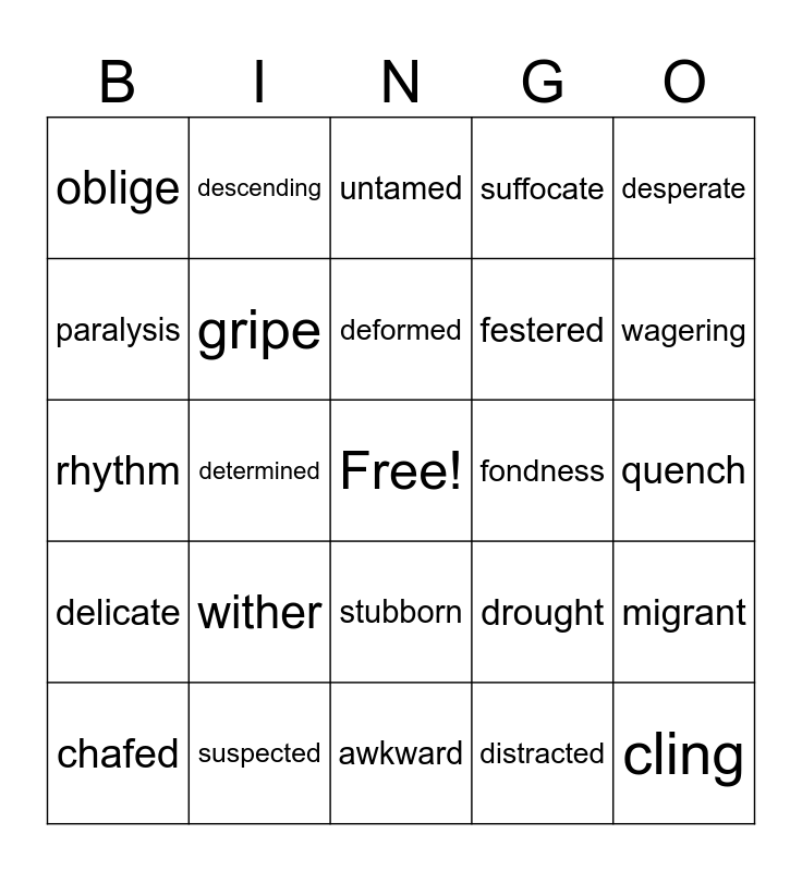 This bingo card has a free space and 33 words: bawling, scowl, determined, wince, delicate, gripe, desperate, chafed, descending, excavating, deformed, untamed, forsaken, agony, fondness, wagering, suspected, rhythm, wither, drought, stubborn, compliment, oblige, quench, awkward, cling, suffocate, festered, paralysis, migrant, amateur, distracted and revive.