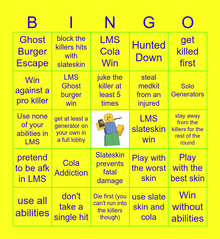 This bingo card has a free space and 24 words: use all abilities, Cola Addiction, juke the killer at least 5 times, use slate skin and cola, get killed first, Ghost Burger Escape, block the killers hits with slateskin, LMS Cola Win, LMS slateskin win, stay away from the killers for the rest of the round, Use none of your abilities in LMS, LMS Ghost burger win, Play with the worst skin, Play with the best skin, Win against a pro killer, don't take a single hit, Die first (you can't run into the killers though), Hunted Down, Solo Generators, pretend to be afk in LMS, get at least a generator on your own in a full lobby, Slateskin prevents fatal damage, steal medkit from an injured and Win without abilities.
