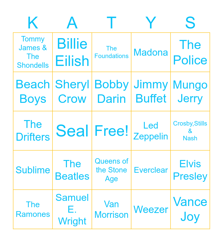 This bingo card has a free space and 24 words: The Beatles, Samuel E. Wright, Bobby Darin, The Ramones, The Police, Tommy James & The Shondells, Beach Boys, Billie Eilish, Led Zeppelin, Queens of the Stone Age, Jimmy Buffet, The Drifters, Everclear, Elvis Presley, Sheryl Crow, Weezer, Crosby,Stills & Nash, The Foundations, Mungo Jerry, Seal, Vance Joy, Sublime, Madona and Van Morrison.