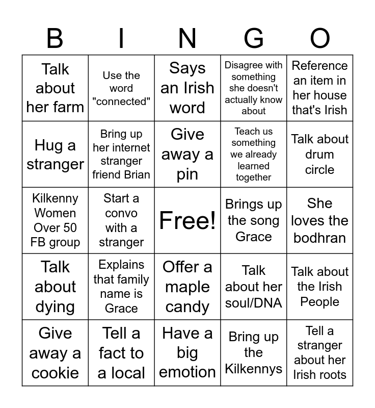 This bingo card has a free space and 24 words: Explains that family name is Grace, Tell a fact to a local, Give away a pin, Give away a cookie, Reference an item in her house that's Irish, Talk about her farm, Hug a stranger, Use the word "connected", Brings up the song Grace, Offer a maple candy, Teach us something we already learned together, Kilkenny Women Over 50 FB group, Talk about her soul/DNA, Talk about the Irish People, Bring up her internet stranger friend Brian, Bring up the Kilkennys, She loves the bodhran, Says an Irish word, Talk about drum circle, Start a convo with a stranger, Tell a stranger about her Irish roots, Talk about dying, Disagree with something she doesn't actually know about and Have a big emotion.