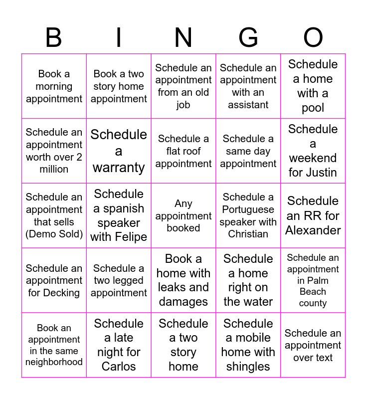 This bingo card has a free space and 24 words: Schedule a two legged appointment, Schedule a late night for Carlos, Schedule a flat roof appointment, Book an appointment in the same neighborhood, Schedule a home with a pool, Book a morning appointment, Schedule an appointment worth over 2 million, Book a two story home appointment, Schedule a Portuguese speaker with Christian, Book a home with leaks and damages, Schedule a same day appointment, Schedule an appointment that sells (Demo Sold), Schedule a home right on the water, Schedule an appointment in Palm Beach county, Schedule a warranty, Schedule a mobile home with shingles, Schedule an RR for Alexander, Schedule an appointment from an old job, Schedule a weekend for Justin, Schedule a spanish speaker with Felipe, Schedule an appointment over text, Schedule an appointment for Decking, Schedule an appointment with an assistant and Schedule a two story home.
