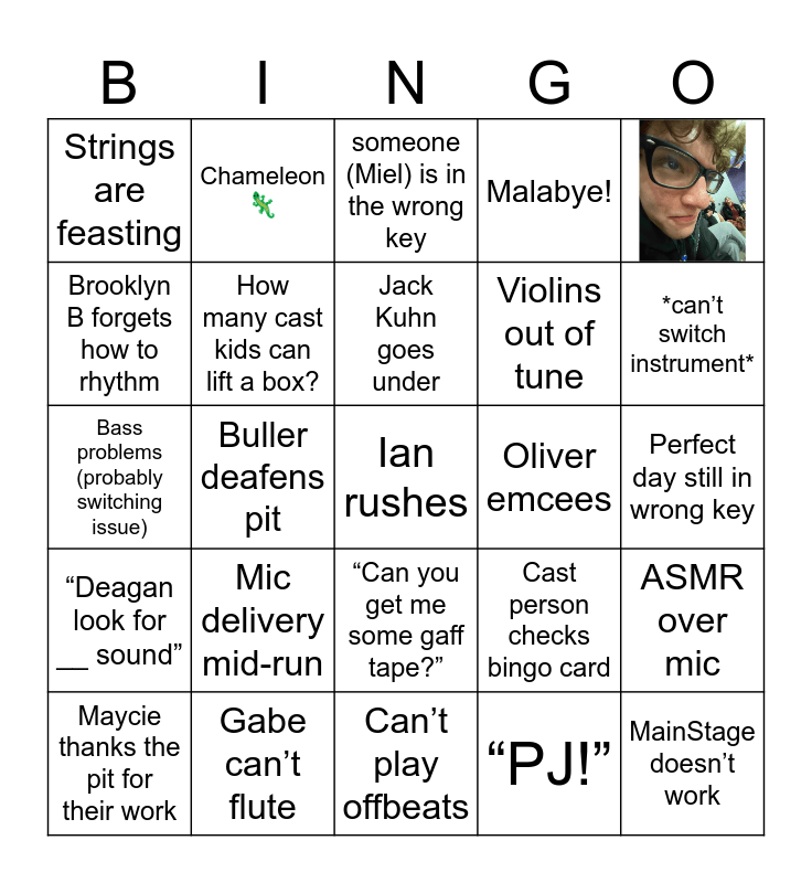 This bingo card has 1 images, a free space and 26 words: Cast person checks bingo card, Guitar sound issues, Violins out of tune, Can’t play offbeats, Brooklyn B forgets how to rhythm, someone (Miel) is in the wrong key, Chameleon 🦎, “Deagan look for __ sound”, Oliver emcees, ASMR over mic, Bass problems (probably switching issue), Malabye!, Maycie thanks the pit for their work, Gabe can’t flute, *can’t switch instrument*, Limerick!, How many cast kids can lift a box?, Jack Kuhn goes under, Mic delivery mid-run, Strings are feasting, Perfect day still in wrong key, “PJ!”, Buller deafens pit, MainStage doesn’t work, “Can you get me some gaff tape?” and CCCCCC AAAA minor FFFFFF GGGG7.