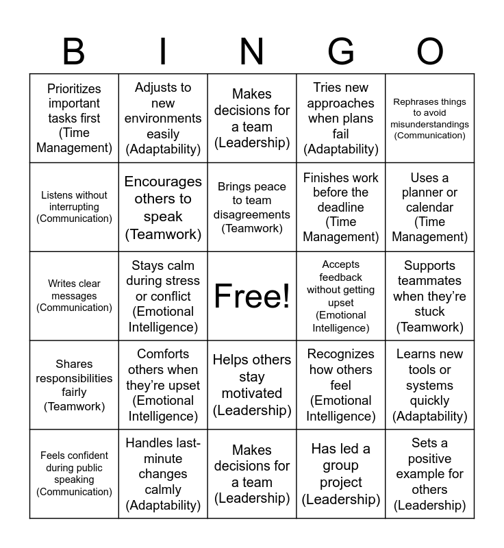 This bingo card has a free space and 24 words: Comforts others when they’re upset (Emotional Intelligence), Handles last-minute changes calmly (Adaptability), Brings peace to team disagreements (Teamwork), Feels confident during public speaking (Communication), Rephrases things to avoid misunderstandings (Communication), Prioritizes important tasks first (Time Management), Listens without interrupting (Communication), Adjusts to new environments easily (Adaptability), Accepts feedback without getting upset (Emotional Intelligence), Helps others stay motivated (Leadership), Finishes work before the deadline (Time Management), Writes clear messages (Communication), Recognizes how others feel (Emotional Intelligence), Learns new tools or systems quickly (Adaptability), Encourages others to speak (Teamwork), Has led a group project (Leadership), Supports teammates when they’re stuck (Teamwork), Makes decisions for a team (Leadership), Uses a planner or calendar (Time Management), Stays calm during stress or conflict (Emotional Intelligence), Sets a positive example for others (Leadership), Shares responsibilities fairly (Teamwork), Tries new approaches when plans fail (Adaptability) and Makes decisions for a team (Leadership).