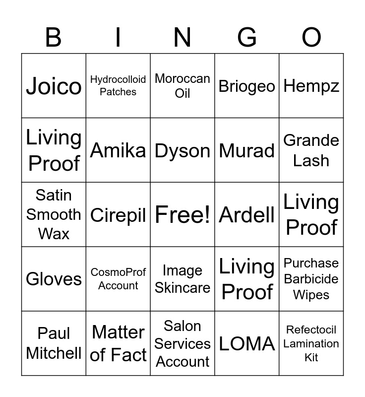 This bingo card has a free space and 26 words: Dermalogica, CosmoProf Account, Salon Services Account, LOMA, Grande Lash, Joico, Hydrocolloid Patches, Moroccan Oil, Murad, Purchase Barbicide Wipes, Satin Smooth Wax, Cirepil, Living Proof, Refectocil Lamination Kit, Gloves, Matter of Fact, Dyson, Ardell, Hempz, Paul Mitchell, Amika, Image Skincare, Briogeo, Living Proof, Living Proof and K18.