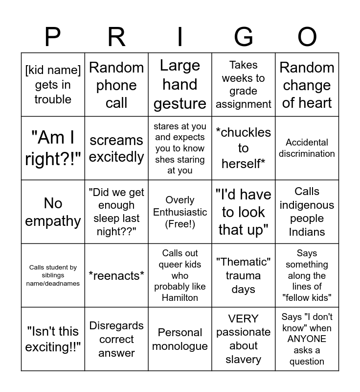 This bingo card has a free space and 29 words: "Isn't this exciting!!", *crickets*, "Did we get enough sleep last night??", Carter lore drop, [kid name] gets in trouble, Large hand gesture, screams excitedly, *reenacts*, "I'd have to look that up", Disregards correct answer, Calls indigenous people Indians, Says "I don't know" when ANYONE asks a question, Personal monologue, VERY passionate about slavery, Accidental discrimination, Hamilton joke, Calls out queer kids who probably like Hamilton, Calls student by siblings name/deadnames, Random change of heart, No empathy, "Thematic" trauma days, Award winning video, *chuckles to herself*, "Am I right?!", Takes weeks to grade assignment, Random phone call, Says something along the lines of "fellow kids", stares at you and expects you to know shes staring at you and "Don't line up at the DOOR!!!!!!".