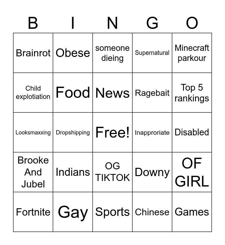 This bingo card has a free space and 24 words: Indians, Gay, News, Fortnite, Minecraft parkour, Brainrot, Child explotiation, Obese, Inapproriate, OG TIKTOK, Ragebait, Looksmaxxing, Downy, OF GIRL, Food, Chinese, Disabled, someone dieing, Top 5 rankings, Dropshipping, Games, Brooke And Jubel, Supernatural and Sports.