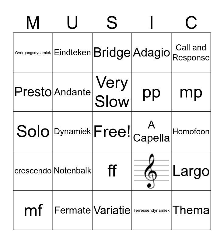 This bingo card has 1 images, a free space and 47 words: Melodie, Thema, Motief, Variatie, Notenbalk, G-sleutel, Eindteken, Ritme, Presto, Allegro, Andante, Adagio, Largo, Fast, f, Very Slow, A Capella, Close Harmony, Call and Response, Dynamiek, Terressendynamiek, Overgangsdynamiek, pp, p, mp, mf, f, ff, crescendo, decrescendo, Articulatie, Legato, Staccato, Fermate, Eenstemmig, Unisono, Homofoon, Polyfoon, Intro, Couplet, Refrein, Bridge, Tussenspel, Solo, Coda, Slow and Very Fast.