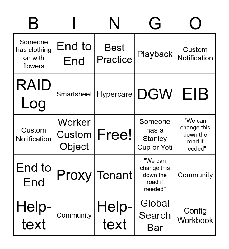 This bingo card has a free space and 47 words: DGW, Config Workbook, EIB, Help-text, Proxy, Tenant, End to End, Go Live, RAID Log, Someone is wearing company attire, Smartsheet, Playback, Community, "We can change this down the road if needed", Custom Object, Smoke Testing, Hypercare, Someone has a Stanley Cup or Yeti, Best Practice, Custom Notification, Worker Custom Object, Global Search Bar, Someone has clothing on with flowers, DGW, Config Workbook, EIB, Help-text, Proxy, Tenant, End to End, Go Live, RAID Log, Someone is wearing company attire, Smartsheet, Playback, Community, "We can change this down the road if needed", Custom Object, Smoke Testing, Hypercare, Someone has a Stanley Cup or Yeti, Best Practice, Custom Notification, Worker Custom Object, Global Search Bar, Someone has clothing on with flowers and Someone cracks a diet coke.