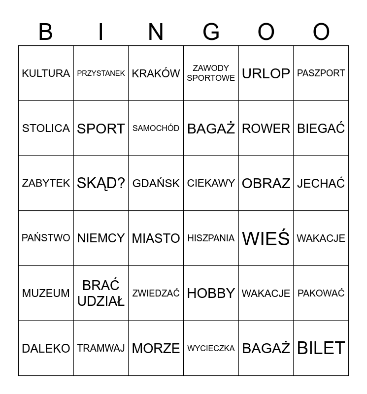 This bingo card has 36 words: HOBBY, ZWIEDZAĆ, WYCIECZKA, STOLICA, PAŃSTWO, CIEKAWY, SPORT, MORZE, URLOP, WAKACJE, BIEGAĆ, ZAWODY SPORTOWE, PAKOWAĆ, SKĄD?, BAGAŻ, KULTURA, MUZEUM, OBRAZ, ZABYTEK, KRAKÓW, GDAŃSK, NIEMCY, HISZPANIA, MIASTO, WIEŚ, PRZYSTANEK, ROWER, TRAMWAJ, SAMOCHÓD, PASZPORT, BILET, DALEKO, WAKACJE, JECHAĆ, BRAĆ UDZIAŁ and BAGAŻ.