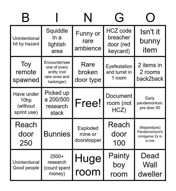 This bingo card has a free space and 44 words: Rare room, Dead Wall dweller, 4+ darkrooms in a row, Unintentional Good people, Gauntlet followed by flicker in next room, Painty boy room, Funny or rare ambience, Rare Room-type, Isn't it bunny item, 2500+ research (count spent money), HCZ code breacher door (red keycard), Document room (not HCZ), Exploded mine or doorstopper, Bunnies, 2 PDG speakers back2back, Huge room, Close call, Have under 10hp (without sprint use), Survive 50 doors in a row lockerless, 2 items in 2 rooms back2back, Squiddle in a lightish area, 2 Squiddles hugging/ overlapping, 4 entities/hazards in 1 room, Unintentional hit by hazard, Harbinger encounter, Early pandemonium. pre door 50, Early Ridge room-type. pre door 50, No damage taken for 50 doors, Reach door 100, Reach door 250, Reach door 400, Skipped(pss) Pandemonium's minigame 2x in a row, Hit by Divine, Hit by Bottomfeeder, Picked up a 200/500 research stack, Room generation error/overlap, Mr. Lopee encounter (out of bounds), HP regen, Rare broken door type, Toy remote spawned, Eyefestation and turret in 1 room, 3 different angler variations in a row, Encounter/see one of every entity (not rare ones and harbinger) and Encounter every hazard type.