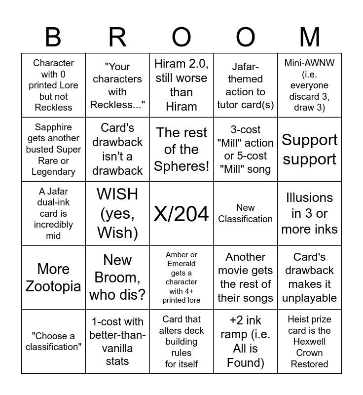 This bingo card has a free space and 24 words: New Broom, who dis?, 1-cost with better-than- vanilla stats, The rest of the Spheres!, "Choose a classification", Mini-AWNW (i.e. everyone discard 3, draw 3), Character with 0 printed Lore but not Reckless, Sapphire gets another busted Super Rare or Legendary, "Your characters with Reckless...", New Classification, Amber or Emerald gets a character with 4+ printed lore, 3-cost "Mill" action or 5-cost "Mill" song, A Jafar dual-ink card is incredibly mid, Another movie gets the rest of their songs, Card's drawback makes it unplayable, Card's drawback isn't a drawback, +2 ink ramp (i.e. All is Found), Illusions in 3 or more inks, Hiram 2.0, still worse than Hiram, Support support, WISH (yes, Wish), Heist prize card is the Hexwell Crown Restored, More Zootopia, Jafar-themed action to tutor card(s) and Card that alters deck building rules for itself.