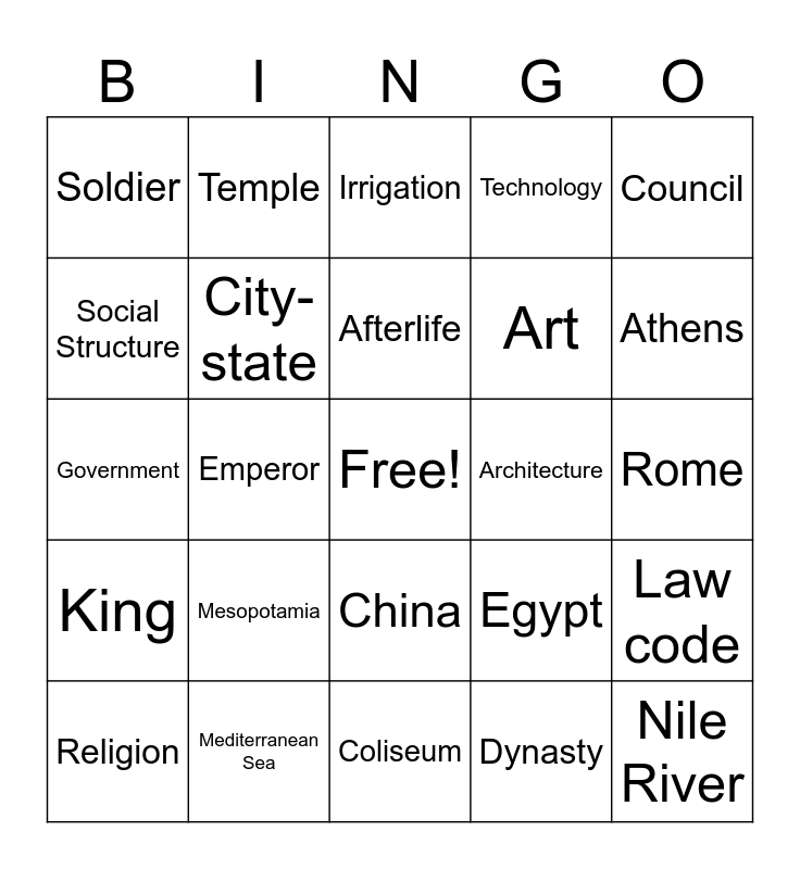 This bingo card has a free space and 32 words: Dynasty, Trade route, Emperor, Pharaoh, King, City-state, Council, Law code, Temple, Polytheism, Afterlife, Irrigation, Writing Systems, Mathematics, Architecture, Stable Food Supply, Religion, Government, China, Mesopotamia, Egypt, Greece, Rome, Mediterranean Sea, Nile River, Technology, Art, Social Structure, Soldier, Coliseum, Sparta and Athens.