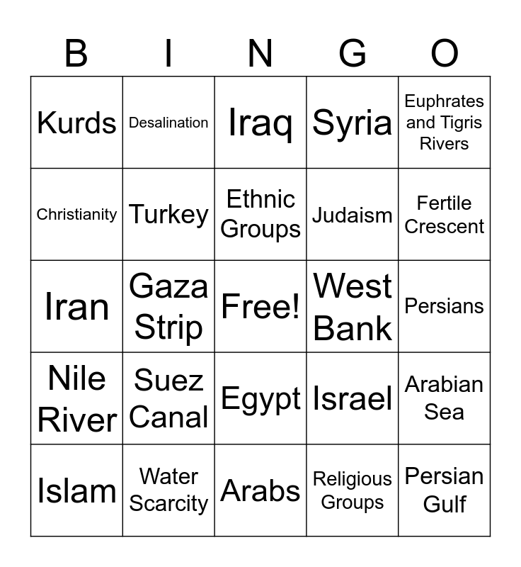 This bingo card has a free space and 24 words: Suez Canal, Water Scarcity, Ethnic Groups, Islam, Euphrates and Tigris Rivers, Kurds, Christianity, Desalination, West Bank, Egypt, Judaism, Iran, Israel, Arabian Sea, Turkey, Religious Groups, Persians, Iraq, Fertile Crescent, Gaza Strip, Persian Gulf, Nile River, Syria and Arabs.