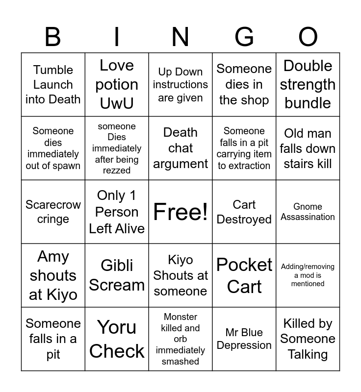 This bingo card has a free space and 29 words: Someone falls in a pit, Licith Accidently Kills someone, Only 1 Person Left Alive, "someone's dead", Tumble Launch into Death, Up Down instructions are given, someone Dies immediately after being rezzed, Gibli Scream, Cart Destroyed, Yoru Check, Gnome Assassination, Killed by Someone Talking, Monster killed and orb immediately smashed, Mr Blue Depression, Old man falls down stairs kill, Hourglass shennanigans, Kiyo Shouts at someone, Amy shouts at Kiyo, Double strength bundle, Scarecrow cringe, Pocket Cart, Item smashed in extraction, Someone falls in a pit carrying item to extraction, Someone dies immediately out of spawn, Someone dies in the shop, Love potion UwU, Adding/removing a mod is mentioned, Death chat argument and Gun gets lost.