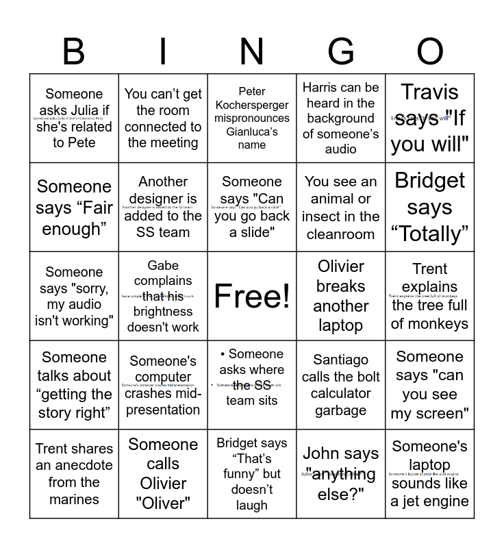 This bingo card has 11 images, a free space and 27 words: Santiago calls the bolt calculator garbage, Someone says “We’ve found another loose bolt”, You see an animal or insect in the cleanroom, Bridget says “That’s funny” but doesn’t laugh, Someone says “Fair enough”, Peter Kochersperger mispronounces Gianluca’s name, You can’t get the room connected to the meeting, Someone talks about “getting the story right”, Olivier breaks another laptop, Someone says "can you see my screen", Someone says "sorry, my audio isn't working", Harris can be heard in the background of someone’s audio, Trent shares an anecdote from the marines, Someone calls Olivier "Oliver", Bridget says “Totally”, Someone asks you to "take as many pictures as you can", Another designer is added to the SS team, Someone says "Can you go back a slide", Someone's computer crashes mid-presentation, Someone asks Julia if she's related to Pete, Trent explains the tree full of monkeys, John says "anything else?", Gabe complains that his brightness doesn't work, Someone's laptop sounds like a jet engine, • Someone asks where the SS team sits, Travis says "If you will" and Someone mispronounces "Routing Cage".