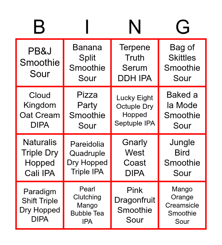 This bingo card has 16 words: Pearl Clutching Mango Bubble Tea IPA, Jungle Bird Smoothie Sour, Terpene Truth Serum DDH IPA, PB&J Smoothie Sour, Naturalis Triple Dry Hopped Cali IPA, Banana Split Smoothie Sour, Gnarly West Coast DIPA, Pink Dragonfruit Smoothie Sour, Cloud Kingdom Oat Cream DIPA, Pizza Party Smoothie Sour, Paradigm Shift Triple Dry Hopped DIPA, Bag of Skittles Smoothie Sour, Pareidolia Quadruple Dry Hopped Triple IPA, Baked a la Mode Smoothie Sour, Lucky Eight Octuple Dry Hopped Septuple IPA and Mango Orange Creamsicle Smoothie Sour.