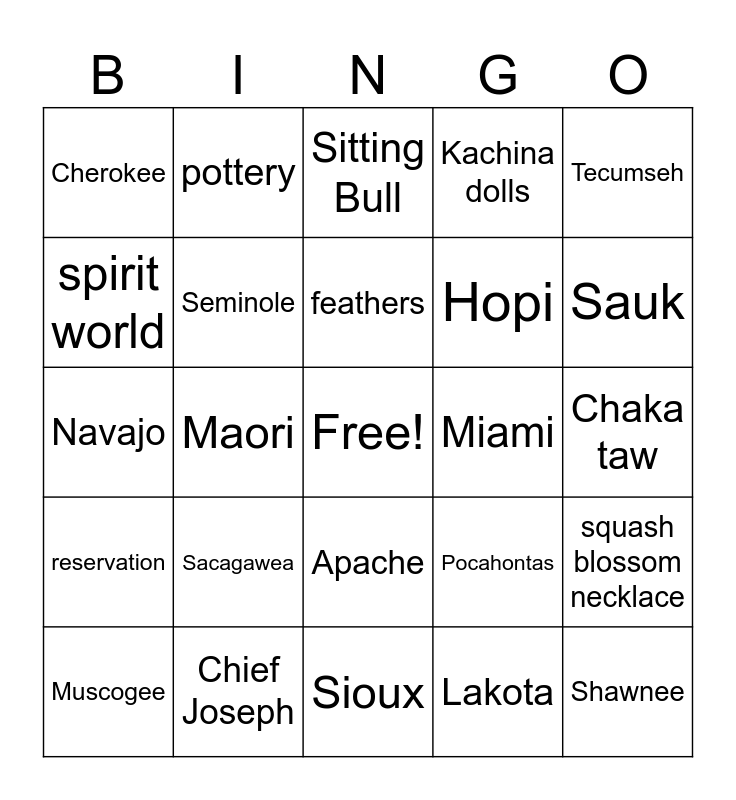 This bingo card has a free space and 29 words: Muscogee, Shoshone, Maori, Black Hawk, Cherokee, Sitting Bull, Seminole, Sacagawea, Miami, Chief Joseph, Chaka taw, Shawnee, Sioux, Lakota, Sauk, Blackfeet, Apache, reservation, Tecumseh, Navajo, Pocahontas, Cheyenne, Hopi, spirit world, Kachina dolls, pottery, squash blossom necklace, feathers and dream catchers.