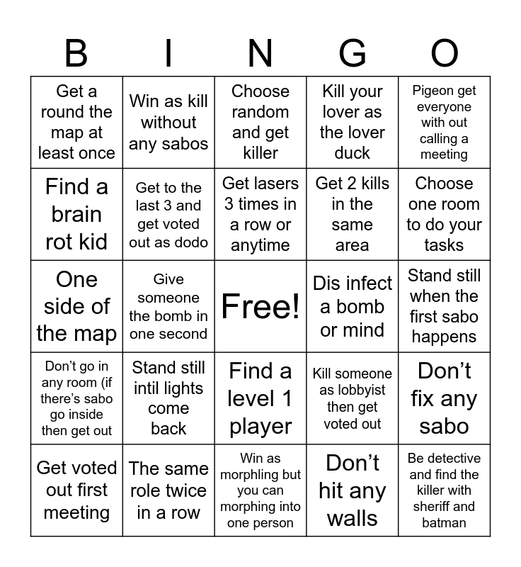 This bingo card has a free space and 24 words: Stand still intil lights come back, The same role twice in a row, Get lasers 3 times in a row or anytime, Get voted out first meeting, Pigeon get everyone with out calling a meeting, Get a round the map at least once, Find a brain rot kid, Win as kill without any sabos, Dis infect a bomb or mind, Find a level 1 player, Get 2 kills in the same area, One side of the map, Kill someone as lobbyist then get voted out, Don’t fix any sabo, Get to the last 3 and get voted out as dodo, Don’t hit any walls, Stand still when the first sabo happens, Choose random and get killer, Choose one room to do your tasks, Give someone the bomb in one second, Be detective and find the killer with sheriff and batman, Don’t go in any room (if there’s sabo go inside then get out, Kill your lover as the lover duck and Win as morphling but you can morphing into one person.