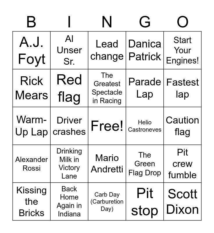 This bingo card has a free space and 24 words: Drinking Milk in Victory Lane, Back Home Again in Indiana, The Greatest Spectacle in Racing, Kissing the Bricks, Start Your Engines!, A.J. Foyt, Rick Mears, Al Unser Sr., Helio Castroneves, Mario Andretti, Parade Lap, Warm-Up Lap, The Green Flag Drop, Pit crew fumble, Red flag, Pit stop, Caution flag, Lead change, Fastest lap, Driver crashes, Scott Dixon, Alexander Rossi, Danica Patrick and Carb Day (Carburetion Day).