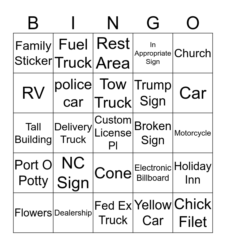 This bingo card has 25 words: NC Sign, Fed Ex Truck, Tow Truck, Flowers, Church, Family Sticker, RV, Fuel Truck, Broken Sign, Cone, Trump Sign, Tall Building, Electronic Billboard, Holiday Inn, police car, Chick Filet, Motorcycle, Rest Area, Car, Delivery Truck, Custom License Pl, Dealership, Port O Potty, In Appropriate Sign and Yellow Car.