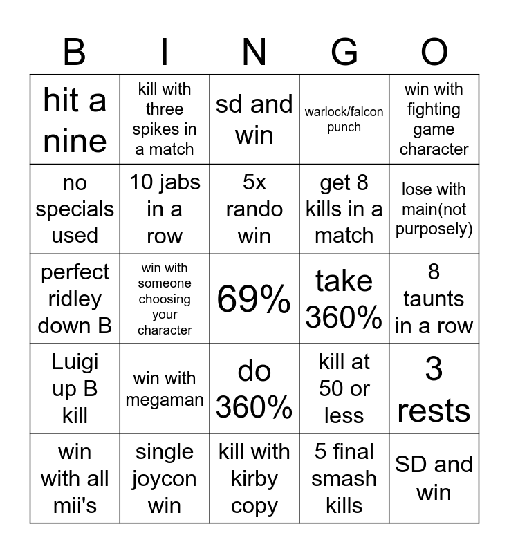 This bingo card has a free space and 24 words: win with megaman, single joycon win, 5x rando win, win with all mii's, win with fighting game character, hit a nine, no specials used, kill with three spikes in a match, take 360%, do 360%, get 8 kills in a match, perfect ridley down B, kill at 50 or less, 3 rests, 10 jabs in a row, 5 final smash kills, 8 taunts in a row, sd and win, lose with main(not purposely), win with someone choosing your character, SD and win, Luigi up B kill, warlock/falcon punch and kill with kirby copy.