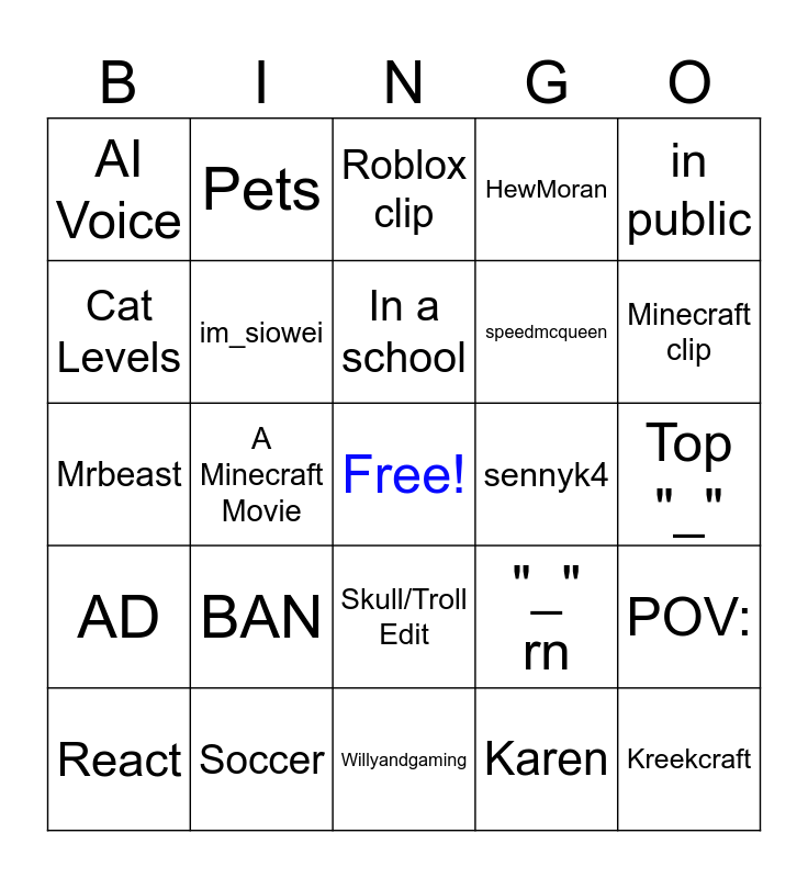 This bingo card has a free space and 24 words: BAN, Soccer, In a school, React, in public, AI Voice, Cat Levels, Pets, sennyk4, Skull/Troll Edit, speedmcqueen, Mrbeast, "_" rn, POV:, im_siowei, Karen, Top "_", Roblox clip, Minecraft clip, A Minecraft Movie, Kreekcraft, AD, HewMoran and Willyandgaming.