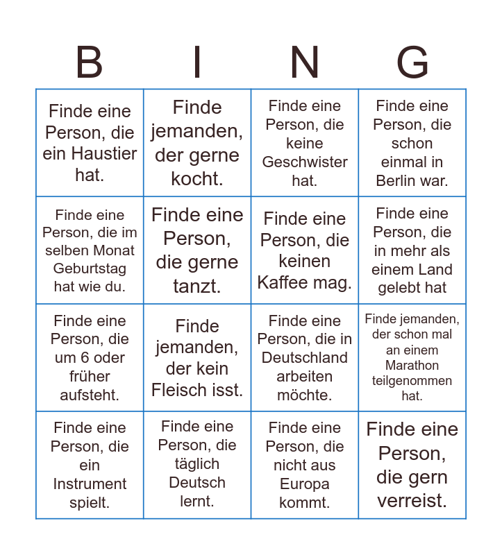This bingo card has 16 words: Finde eine Person, die täglich Deutsch lernt., Finde jemanden, der schon mal an einem Marathon teilgenommen hat., Finde eine Person, die keine Geschwister hat., Finde eine Person, die ein Haustier hat., Finde eine Person, die um 6 oder früher aufsteht., Finde jemanden, der gerne kocht., Finde eine Person, die in Deutschland arbeiten möchte., Finde eine Person, die nicht aus Europa kommt., Finde eine Person, die im selben Monat Geburtstag hat wie du., Finde eine Person, die gerne tanzt., Finde eine Person, die ein Instrument spielt., Finde eine Person, die schon einmal in Berlin war., Finde jemanden, der kein Fleisch isst., Finde eine Person, die in mehr als einem Land gelebt hat, Finde eine Person, die keinen Kaffee mag. and Finde eine Person, die gern verreist..