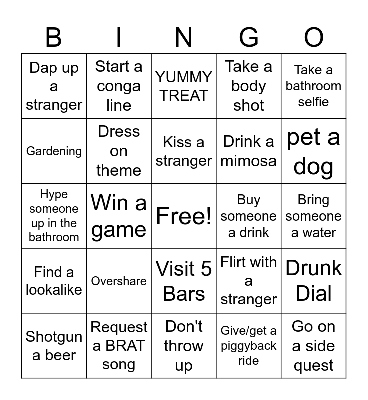 This bingo card has a free space and 29 words: Shotgun a beer, Throw up, Win a game, Arm Wrestle Someone, Dap up a stranger, YUMMY TREAT, Dress on theme, Overshare, Buy someone a drink, Request a BRAT song, Bring someone a water, Go on a side quest, Don't throw up, Give/get a piggyback ride, pet a dog, Give a bald man a high five, Visit 5 Bars, Find a lookalike, Take a bathroom selfie, Hype someone up in the bathroom, Flirt with a stranger, DIP THE DOGS, Drink a mimosa, Gardening, Take a body shot, Start a conga line, Drunk Dial, Kiss a stranger and WORM.