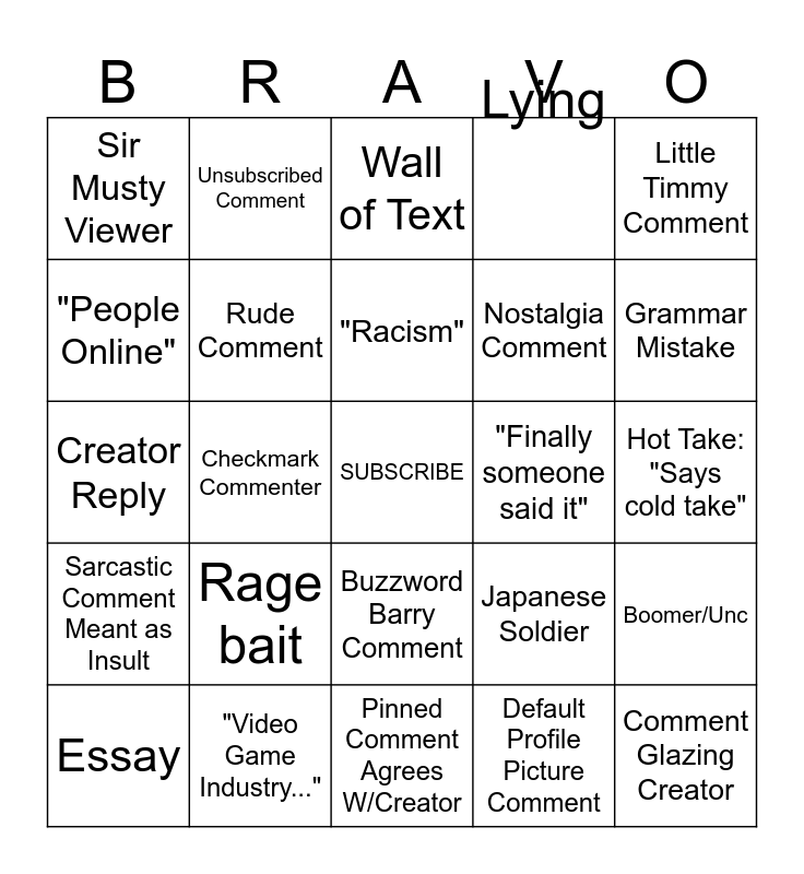 This bingo card has a free space and 30 words: "Video Game Industry...", "I stopped watching after...", Checkmark Commenter, *Insert Random Meme/Joke*, Sir Musty Viewer, Wall of Text, Rude Comment, Buzzword Barry Comment, "Finally someone said it", Pinned Comment Agrees W/Creator, Hot Take: "Says cold take", Comment Glazing Creator, Default Profile Picture Comment, Respectful Comment, Grammar Mistake, Creator pins own comment, Japanese Soldier, Sarcastic Comment Meant as Insult, Rage bait, Little Timmy Comment, Creator Reply, "Am I the only one who...", Unsubscribed Comment, Nostalgia Comment, "People Online", Lying, Boomer/Unc, Essay, "Racism" and Short Comment (15 Words Or Less).