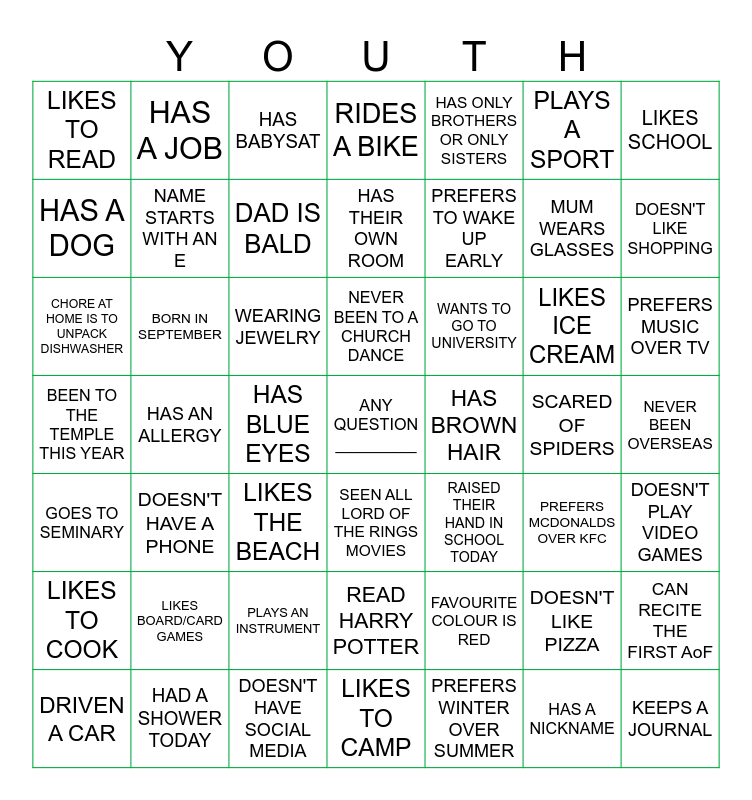 This bingo card has a free space and 48 words: FAVOURITE COLOUR IS RED, MUM WEARS GLASSES, LIKES TO CAMP, HAS AN ALLERGY, WEARING JEWELRY, NEVER BEEN OVERSEAS, HAS A JOB, HAD A SHOWER TODAY, PLAYS A SPORT, SEEN ALL LORD OF THE RINGS MOVIES, LIKES SCHOOL, RIDES A BIKE, LIKES ICE CREAM, WANTS TO GO TO UNIVERSITY, LIKES TO COOK, SCARED OF SPIDERS, HAS A DOG, DOESN'T LIKE SHOPPING, DOESN'T LIKE PIZZA, HAS ONLY BROTHERS OR ONLY SISTERS, PREFERS TO WAKE UP EARLY, HAS BLUE EYES, LIKES TO READ, NAME STARTS WITH AN E, CAN RECITE THE FIRST AoF, DAD IS BALD, PREFERS MUSIC OVER TV, DRIVEN A CAR, NEVER BEEN TO A CHURCH DANCE, BORN IN SEPTEMBER, HAS A NICKNAME, HAS BROWN HAIR, DOESN'T PLAY VIDEO GAMES, LIKES BOARD/CARD GAMES, BEEN TO THE TEMPLE THIS YEAR, RAISED THEIR HAND IN SCHOOL TODAY, PREFERS MCDONALDS OVER KFC, CHORE AT HOME IS TO UNPACK DISHWASHER, LIKES THE BEACH, PLAYS AN INSTRUMENT, GOES TO SEMINARY, KEEPS A JOURNAL, HAS BABYSAT, DOESN'T HAVE SOCIAL MEDIA, HAS THEIR OWN ROOM, READ HARRY POTTER, DOESN'T HAVE A PHONE and PREFERS WINTER OVER SUMMER.
