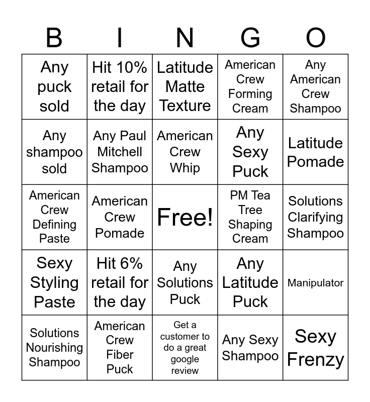 This bingo card has a free space and 24 words: Hit 6% retail for the day, American Crew Fiber Puck, American Crew Whip, Solutions Nourishing Shampoo, Any American Crew Shampoo, Any puck sold, Any shampoo sold, Hit 10% retail for the day, PM Tea Tree Shaping Cream, Any Solutions Puck, Any Sexy Puck, American Crew Defining Paste, Any Latitude Puck, Manipulator, Any Paul Mitchell Shampoo, Any Sexy Shampoo, Solutions Clarifying Shampoo, Latitude Matte Texture, Latitude Pomade, American Crew Pomade, Sexy Frenzy, Sexy Styling Paste, American Crew Forming Cream and Get a customer to do a great google review.
