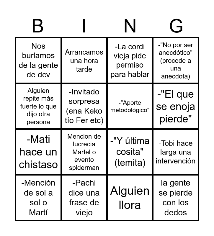 This bingo card has 16 words: -Pachi dice una frase de viejo, -Tobi hace larga una intervención, -La cordi vieja pide permiso para hablar, Nos burlamos de la gente de dcv, -Mati hace un chistaso, Arrancamos una hora tarde, -"Y última cosita" (temita), Alguien llora, Alguien repite más fuerte lo que dijo otra persona, -Invitado sorpresa (ena Keko tío Fer etc), -Mención de sol a sol o Martí, -"No por ser anecdótico" (procede a una anecdota), Mencion de lucrecia Martel o evento spiderman, -"El que se enoja pierde", -"Aporte metodológico" and la gente se pierde con los dedos.