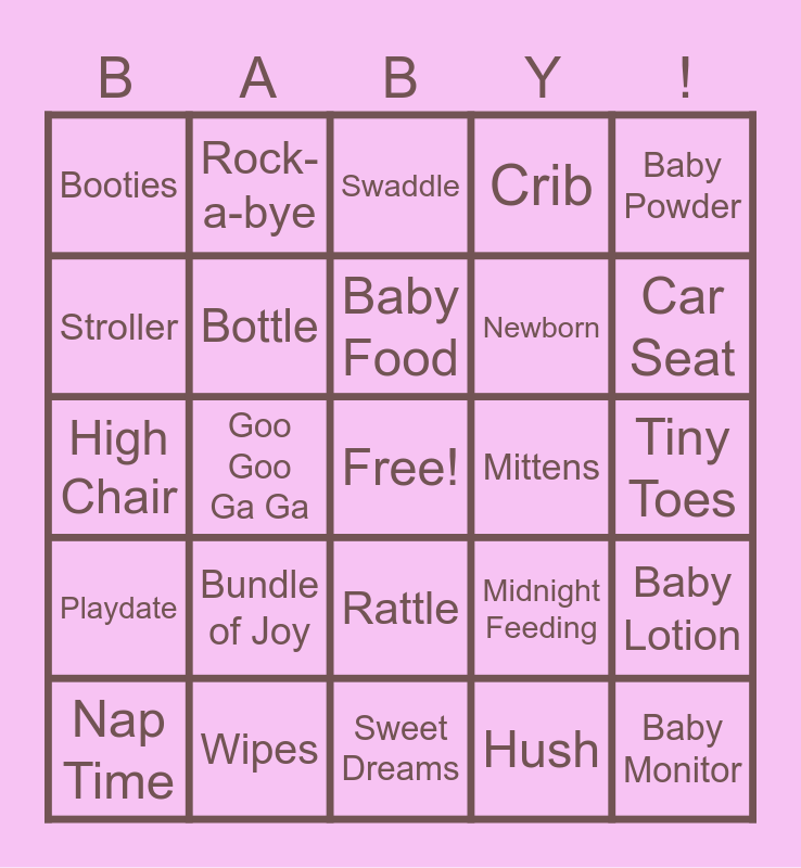 This bingo card has a free space and 35 words: Diaper, Onesie, Pacifier, Bottle, Rattle, Crib, Stroller, Burp Cloth, Baby Food, Mobile, High Chair, Baby Powder, Teething Ring, Bib, Booties, Mittens, Hush, Goo Goo Ga Ga, Playdate, Baby Monitor, Midnight Feeding, Nap Time, Baby Lotion, Wipes, Swaddle, Car Seat, Baby Carrier, Expecting, Newborn, Tiny Toes, Little One, Sweet Dreams, Bundle of Joy, Rock-a-bye and Lullaby.