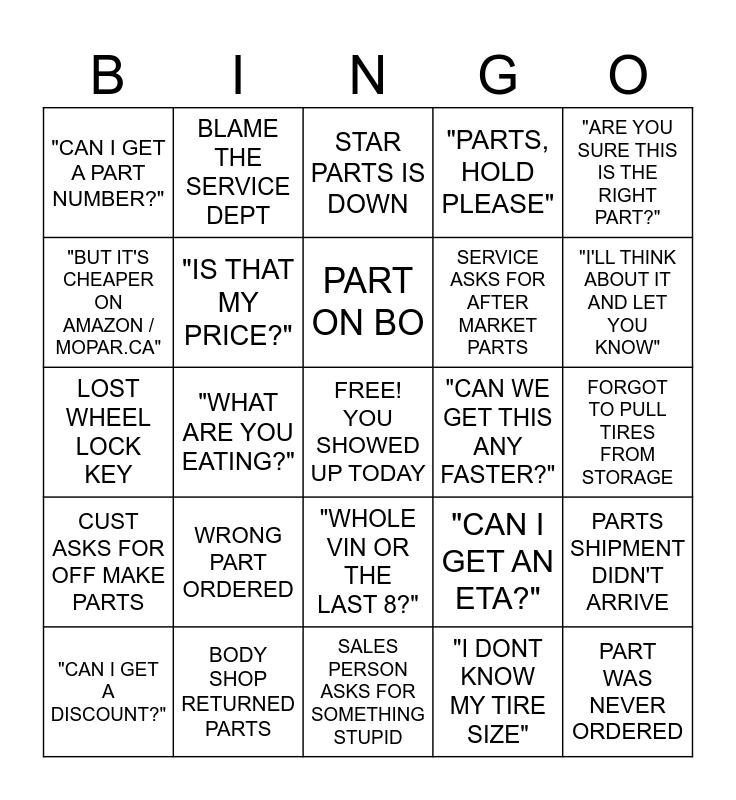 PARTS DEPT | PARTS DEPARTMENT BINGO | A DAY IN THE LIFE OF THE PARTS DEPT. | PARTS DEPARTMENT BINGO | PARTS DEPARTMENT BINGO
