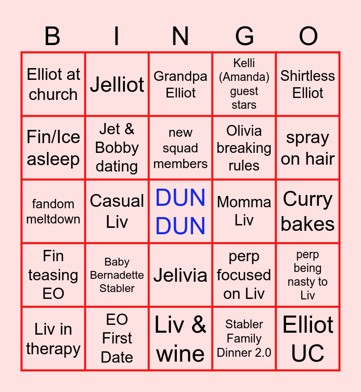 This bingo card has a free space and 62 words: EO Kiss, EO First Date, Noah & El Moment, Fin teasing EO, Domestic EO, Noah interrogating EO, Jet & Bobby dating, Protelliot, Olivia breaking rules, "Free Motherfucker!", Kelli (Amanda) guest stars, Olivia texting while exiting elevator, Fin/Ice asleep, Kathy Stabler mention, "You know what Elliot?", Elliot at church, Elliot UC, Shirtless Elliot, Elliot/Chris naked, new squad members, Momma Liv, Grandpa Elliot, Liv in therapy, Stabler Family Dinner 2.0, Eli & Becky baby girl, Noah w/ McCanns, "I'm ready", someone gets shot, perp being nasty to Liv, Liv self soothing, Randall returns, Joe Jr. returns, Liv wears color, SVU/OC crossover, Curry bakes, Jelliot, Jet UC, Elliot in a Henley, Casual Liv, bald jokes, fandom meltdown, Elliot Stabler III, Baby Bernadette Stabler, "Detective" "Captain", spray on hair, perp focused on Liv, Elliot shot, Elliot kill count +1, Olivia actually kills someone, someone asks Liv out, Jelivia, Liv & wine, "moneybags", squad member goes rouge (not E or O), M has a friend guest star (not Kelli or C), actor recycling, Liv in sunglasses, Serial perp, Previous perp returns, Liv in uniform, Terrance and Carisi driving Liv.