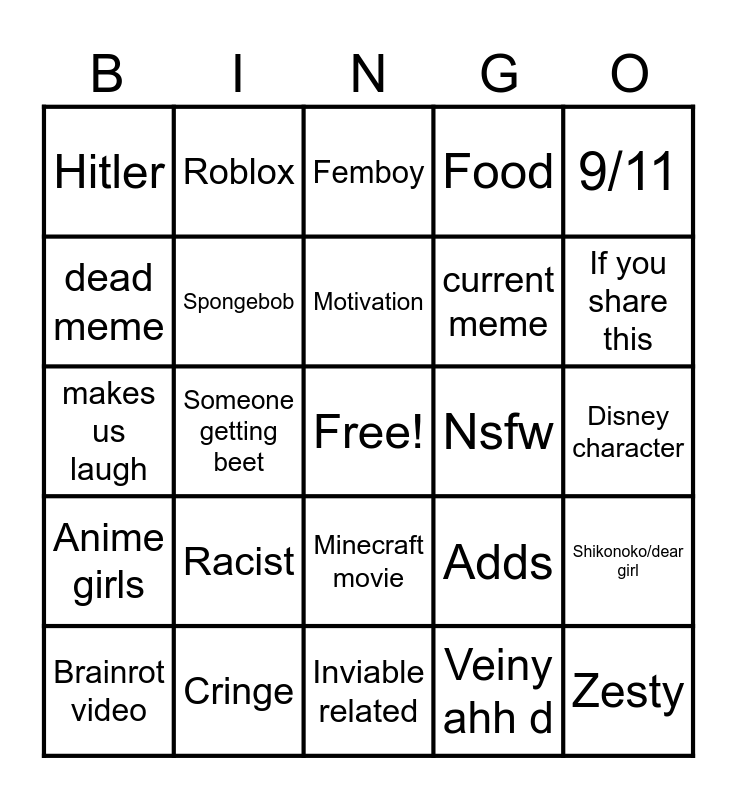 This bingo card has a free space and 24 words: Racist, Cringe, Motivation, Brainrot video, 9/11, Hitler, dead meme, Roblox, Nsfw, Minecraft movie, current meme, makes us laugh, Adds, Shikonoko/dear girl, Spongebob, Veiny ahh d, Disney character, Femboy, If you share this, Someone getting beet, Zesty, Anime girls, Food and Inviable related.