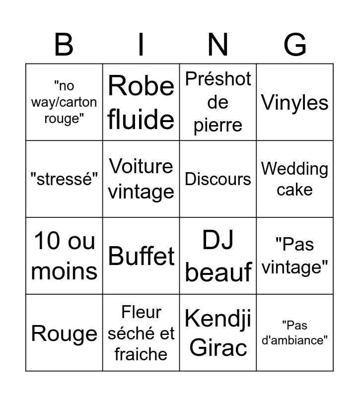 This bingo card has 16 words: Fleur séché et fraiche, "Pas vintage", Préshot de pierre, "no way/carton rouge", 10 ou moins, Robe fluide, DJ beauf, Kendji Girac, "stressé", Voiture vintage, Rouge, Vinyles, Buffet, Wedding cake, Discours and "Pas d'ambiance".
