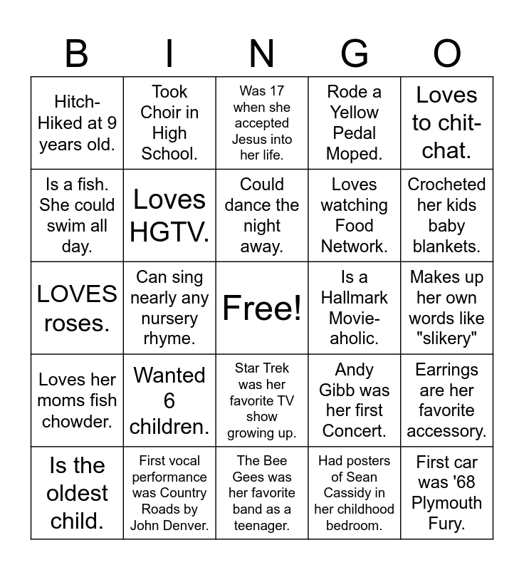 This bingo card has a free space and 44 words: Studied Child Development at JC., First car was '68 Plymouth Fury., Was married for 8 years before having children., Is the oldest child., Claims she has a "black thumb"., Had posters of Sean Cassidy in her childhood bedroom., Was 17 when she accepted Jesus into her life., Loves the color Blue., Loves to chit-chat., First vocal performance was Country Roads by John Denver., Rode a Yellow Pedal Moped., Is a Hallmark Movie-aholic., Star Trek was her favorite TV show growing up., Wanted 6 children., Broke her arm rollerskating., The Bee Gees was her favorite band as a teenager., Was 20 when she got married., LOVES roses., Went on her first Cruise to Alaska., Crocheted her kids baby blankets., Took Choir in High School., Is a world-class seat-dancer., Bright Orange pants with a rainbow shirt was her favorite outfit growing up., Hitch-Hiked at 9 years old., HATES snakes, Makes up her own words like "slikery", Math was her least favorite subject in school, Loved "cruising" with her mom her VW Bug down La Mesa Blvd, Andy Gibb was her first Concert., Loves her moms fish chowder., Favorite childhood meal is fried quesadillas., Earrings are her favorite accessory., Is a Crazy Cat Lady., Wishes she was more crafty., Can sing nearly any nursery rhyme., Went with her son to a Heavy Metal Concert., Enjoys any and all music., Wishes she were bilingual., Could dance the night away., Is a fish. She could swim all day., Loves watching Food Network., Loves Hallmark Channel., Loves HGTV. and Loves solitare..